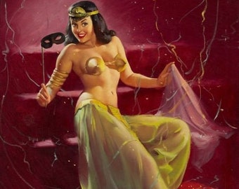 Gil Elvgren Do You Recognize Me Original Painting Pin-Up BETTIE PAGE Harem Costume for Carnival with mask, Legs heels, pinup Daniel Vancas